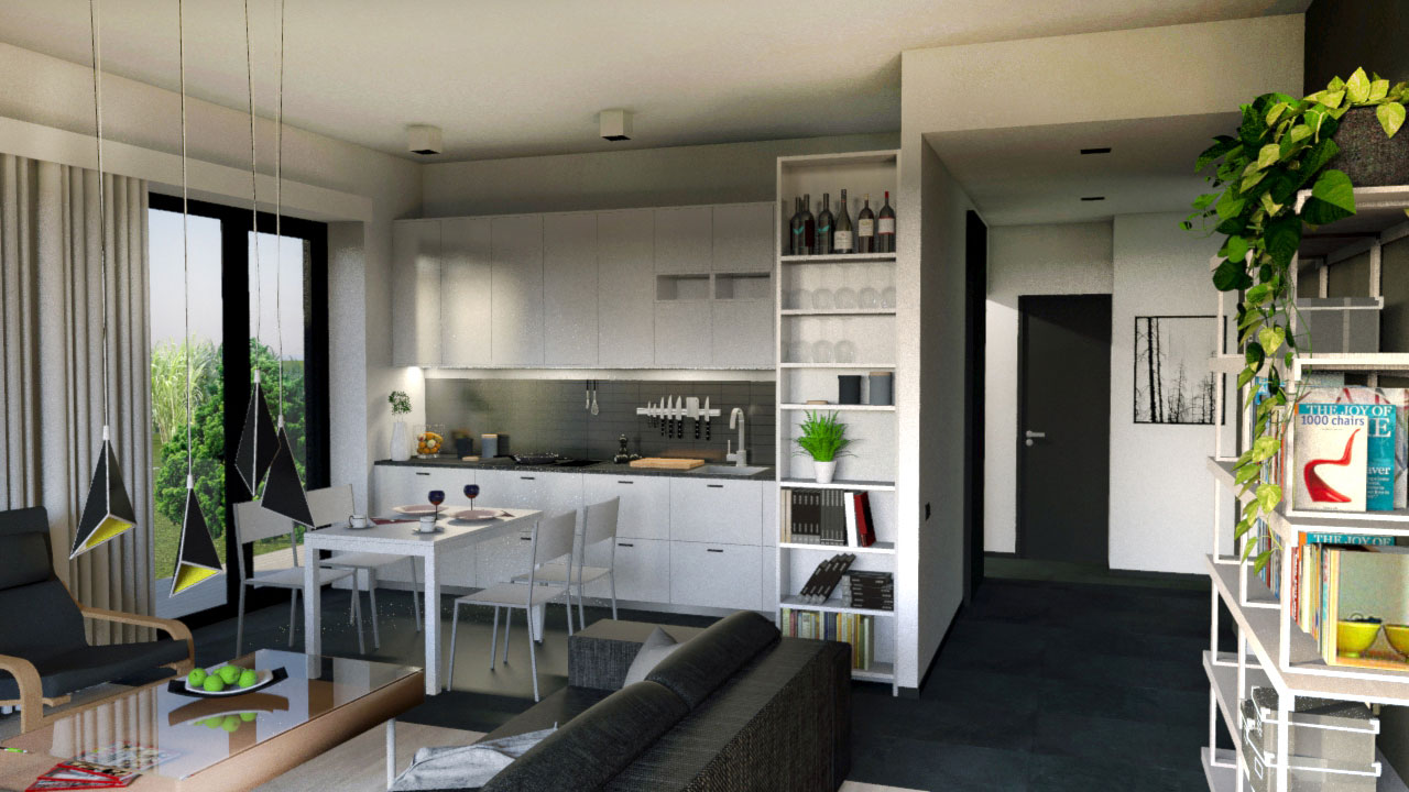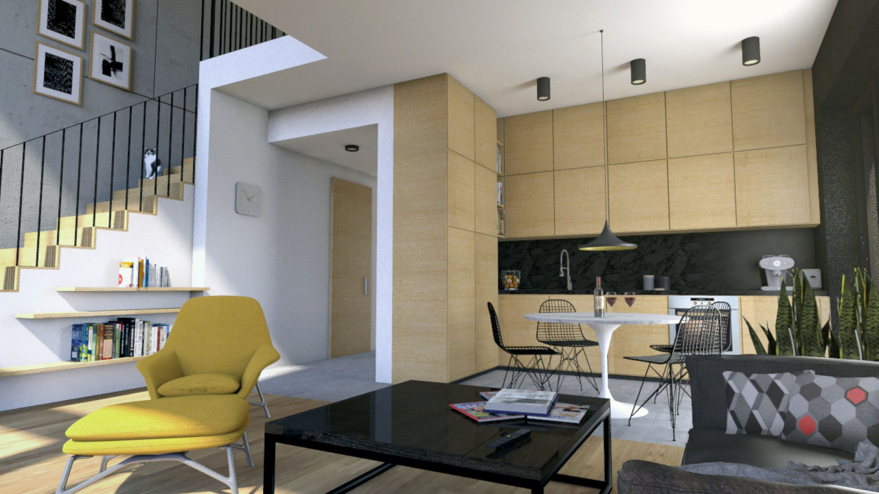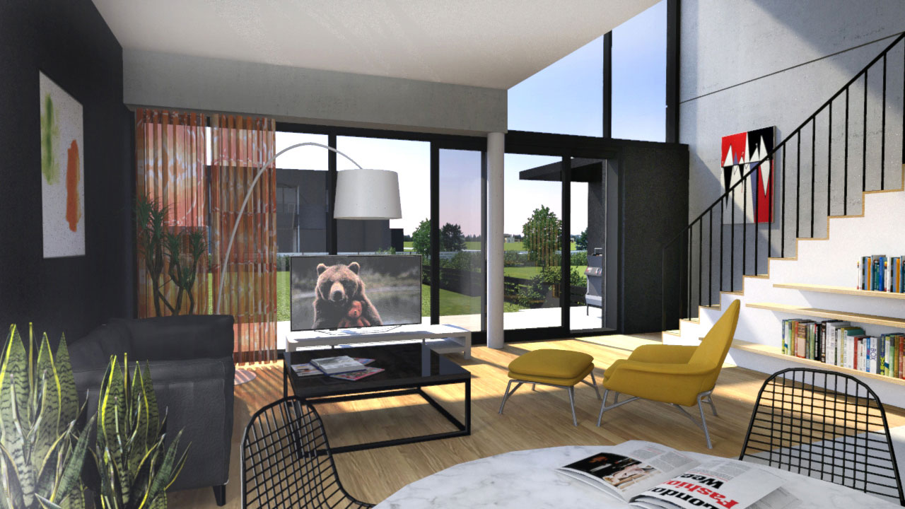 Viimistlusmaterjalid on minimalistlikud: betoon (või krohv), puit ja klaas. Need on materjalid, mis rõhutavad modernsust ja sobivad hästi selle projekti arhitektuurilise stiiliga.